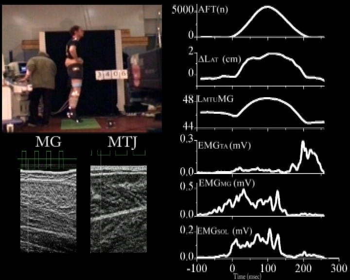 スコープ表面・ワイヤー筋電図、誘発電気刺激(EMS)・経頭蓋磁気刺激法(TMS)、地面反力測定、超音波診断装置による筋腱骨のイメージング、腱張力のダイレクト測定、VICON & ハイスピードカメラなどの測定機器を用いて生体信号や生体内・外の画像解析を行い、身体運動のメカニクスにアプローチしていきます。さらに得られた生体データを用いて、モデリングやシミュレーションを行い、身体運動の可能性にアプローチすることも目指します。 |